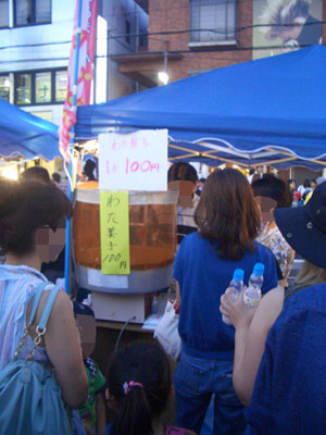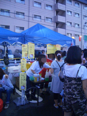 意外や意外。冷やしきゅうりが売れてた。1本100円。浅漬けの素に漬けて冷やし1本そのままを串に刺しただけのきゅうり。小学市中学生くらいの子供たちがほおばっている姿が多数見受けられました。