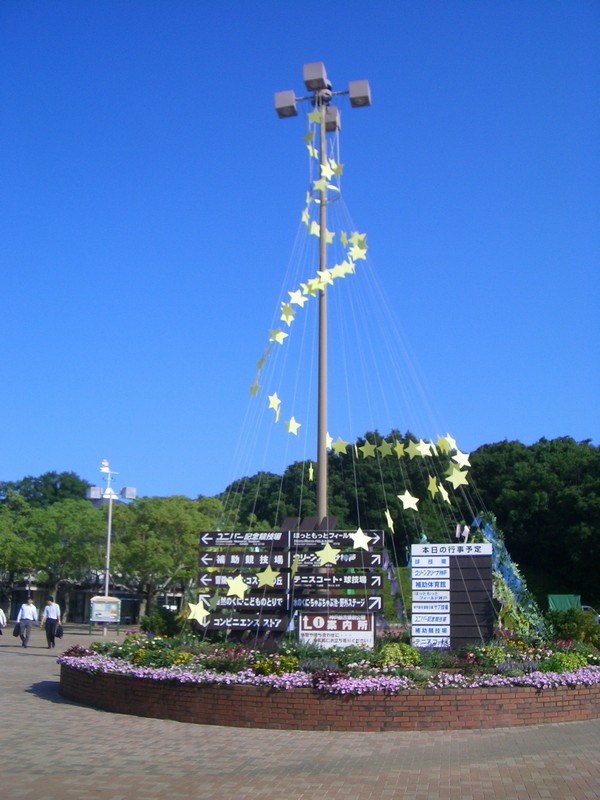 南出口を出て、やや左側にモニュメントがあります。七夕なので願い事を書いた短冊と星の飾りつけがしてありました。まだ梅雨明けしてないのに、澄み切った青空。